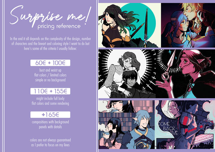 ✦ Surprise Commissions are a type of commission where you leave everything to me and there's minimal contact. If I have doubts or I'm not sure about something I will contact you. Revisions can be made after the piece is finished but only for mistakes or little details I might have missed. Good visual references are important to avoid mistakes.✦ Regular Commissions are the opposite, you decide every detail of the drawing and I will be contacting you once a week to show my progress. Since this includes customer service and less freedom for me, they are usually more expensive but you know for certain how the drawing will look in the end.